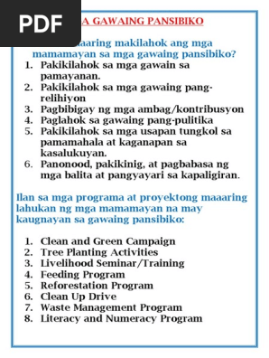 Mga halimbawa ng gawaing pansibiko. Narito ang mga gawaing. 1 civic 2 electoral at 3 political voice.