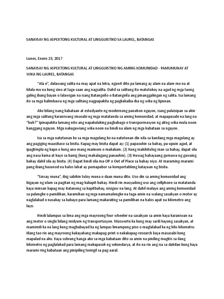 Halimbawa ng sanaysay tungkol sa kultura. Palawakin natin ang ating pag-unawa sa mga bagay na nanyayari sa ating mga paligid. Ganito kasi ang kasaysayan ng Pilipinas mahalaga ang komunidad sa mga buhay ng. Narito ang isang halimbawa ng sanaysay.