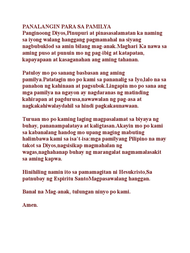 Panginoong Hesus Ikaw po ang aming sandigan sa bawat oras ng aming buhay. Sapagkat Ikaw lamang ang makapagbibigay sa amin ng kapanatagan at kapayapaan anuman ang nangyayari sa aming kapaligiran. Sinasabi sa Santiago 516 Malaki ang nagagawa ng panalangin ng taong matuwid.